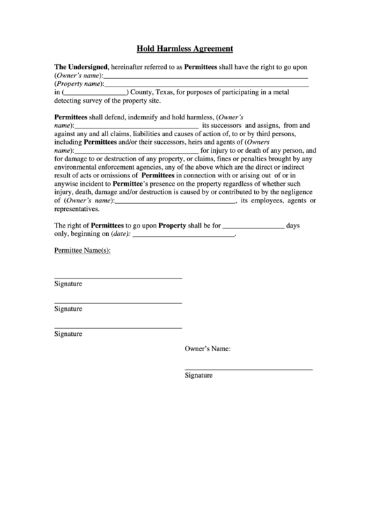 In consideration of permission granted by purdue university allowing me to participate. The subrecipient shall hold harmless, defend and indemnify the grantee from any and all claims, actions, suits, charges and judgments whatsoever . A hold harmless agreement is a kind of contract that focuses on protecting the interest of one party from being liable to the other against damages or . If the hold harmless agreement is being executed in conjunction with another contract, the hold harmless agreement should either be executed before or at the . Waiver of liability and hold harmless agreement.